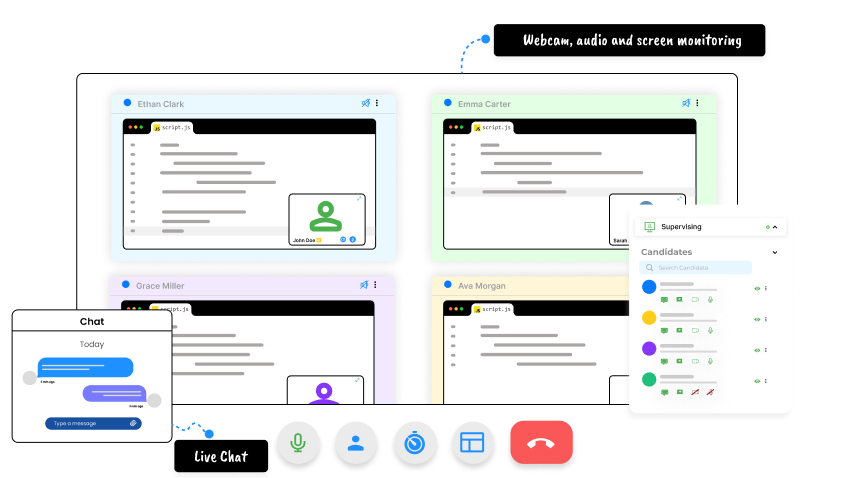 Live coding tests with AI proctoring, screen sharing, webcam, chat, and real-time updates for a transparent and fair assessment.