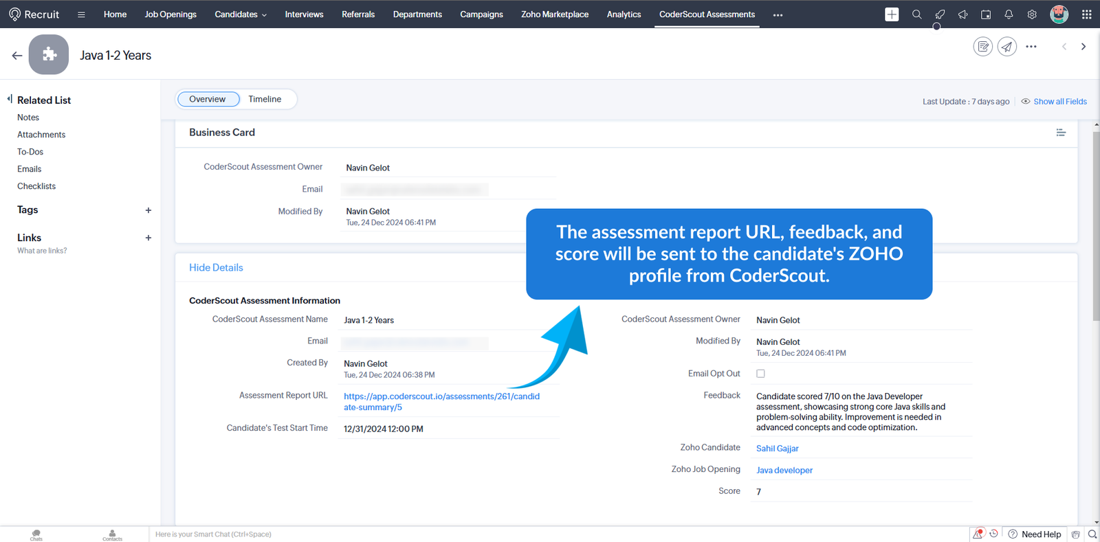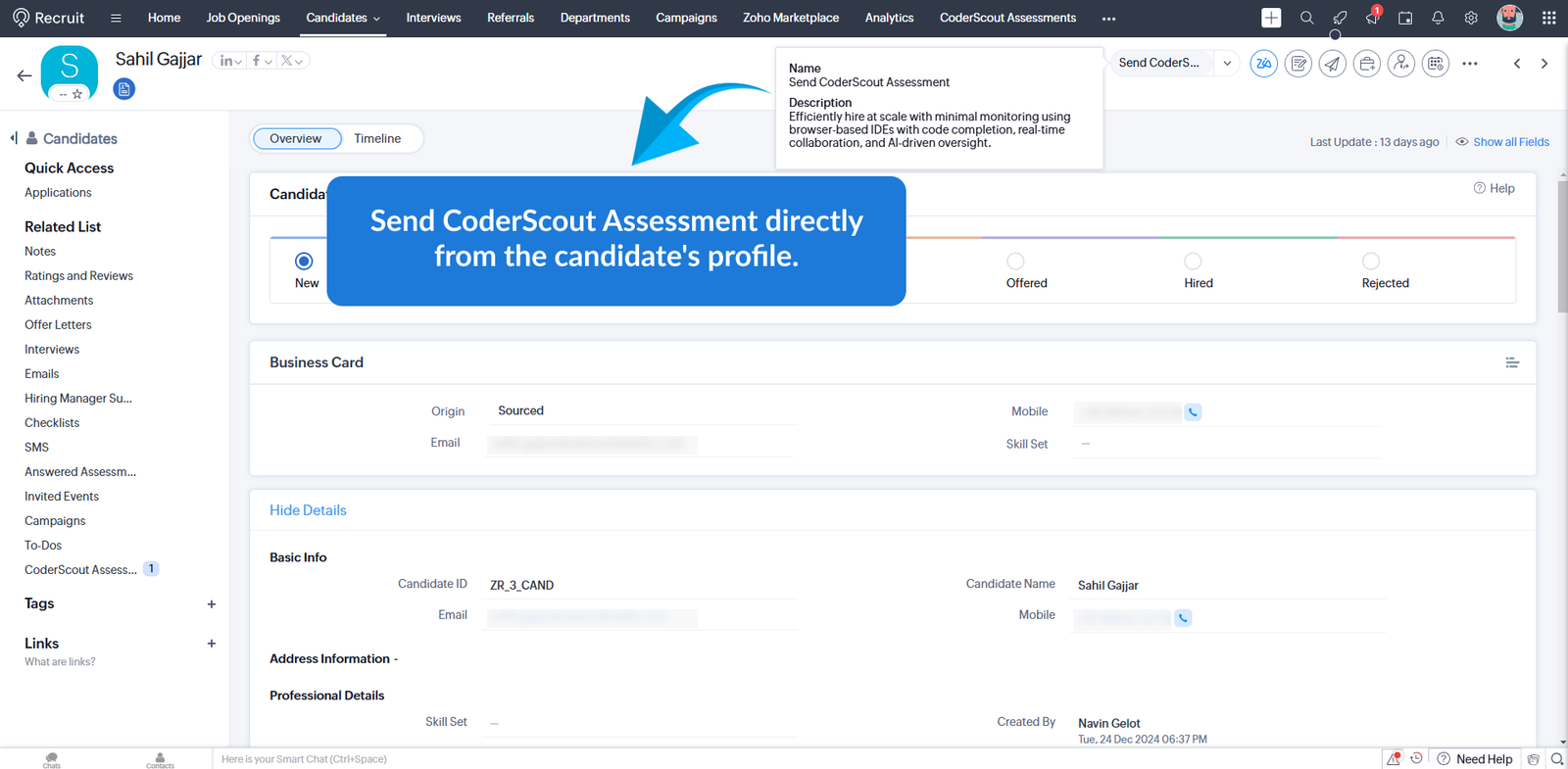 The CoderScout and Zoho Recruit integration enables you to leverage CoderScout’s assessment capabilities alongside Zoho Recruit’s robust ATS features. With this integration, you can effortlessly send CoderScout assessments to candidates directly from the Zoho Recruit interface, ensuring a seamless flow of data between the two platforms.