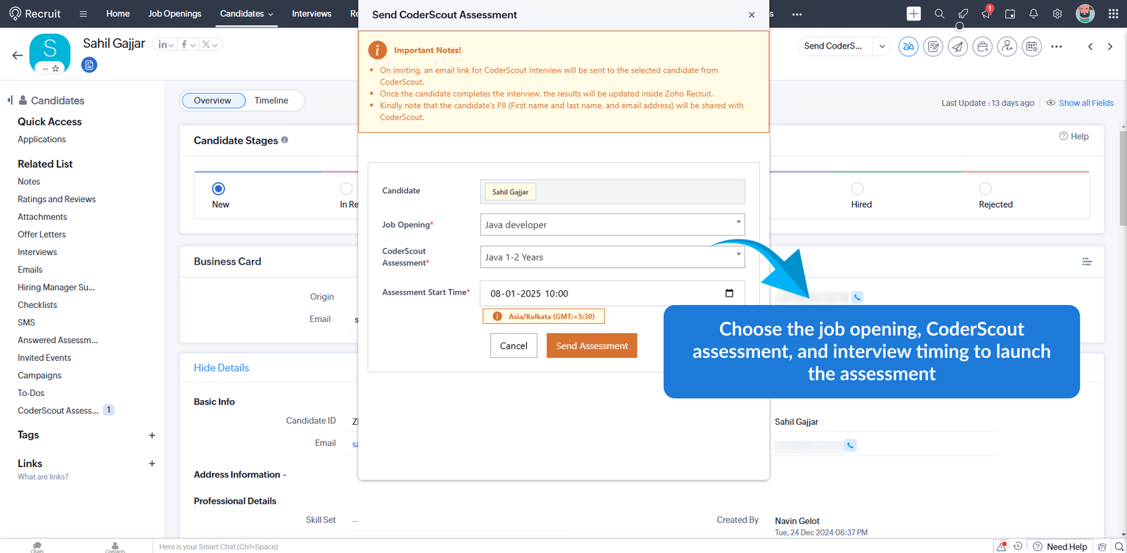 Select the desired job opening, assessment, test start time and send it to the candidate.