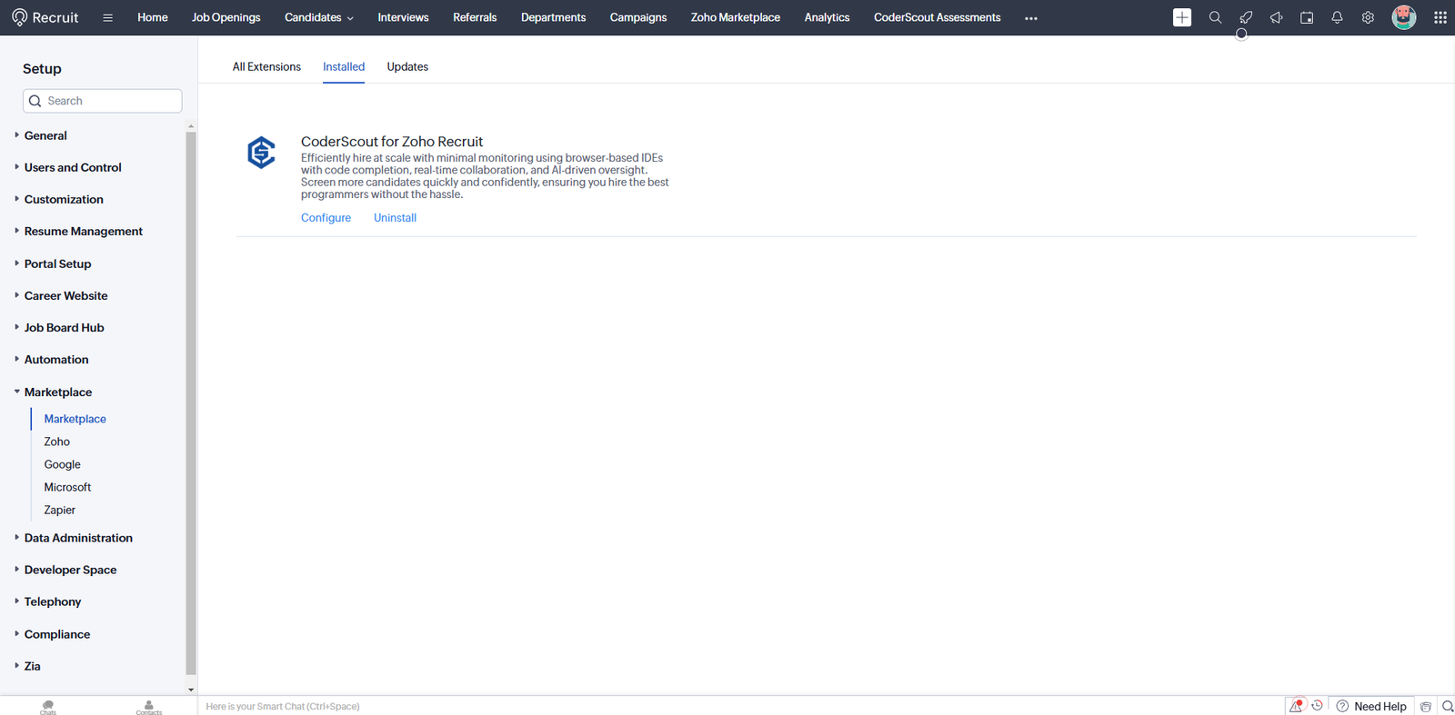Navigate to Settings > Marketplace and search for “CoderScout for Zoho Recruit”. Or directly go to this link and click on Install.