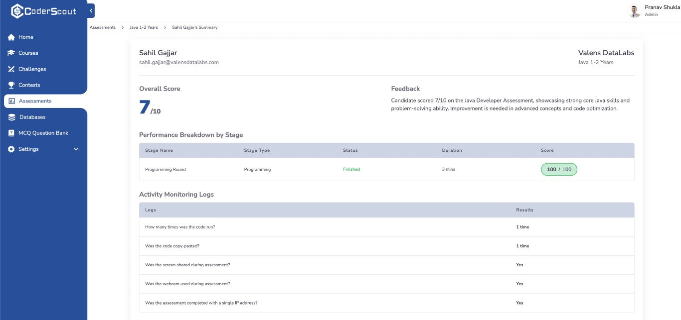 In the candidate’s profile, go to the “CoderScout Assessment” section to view details such as: